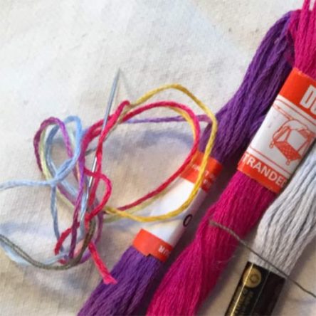 Aprendí a bordar en el colegio. Allá por el año 1982 bordábamos casi todas las tardes después de comer. Acudí a un colegio de monjas en el sur de Madrid y nos enseñaron a hacer punto, coser y bordar. También tocábamos la bandurria y trabajábamos el jardín. Bordar me gustaba mucho y recuerdo que encontrar los materiales necesarios no fue trabajo fácil para mi madre. Recorrimos todo Madrid para hacernos con el kit básico que constaba de tela especial y de varios ovillos de colores muy vivos (que todavía conservo con mucho cariño).